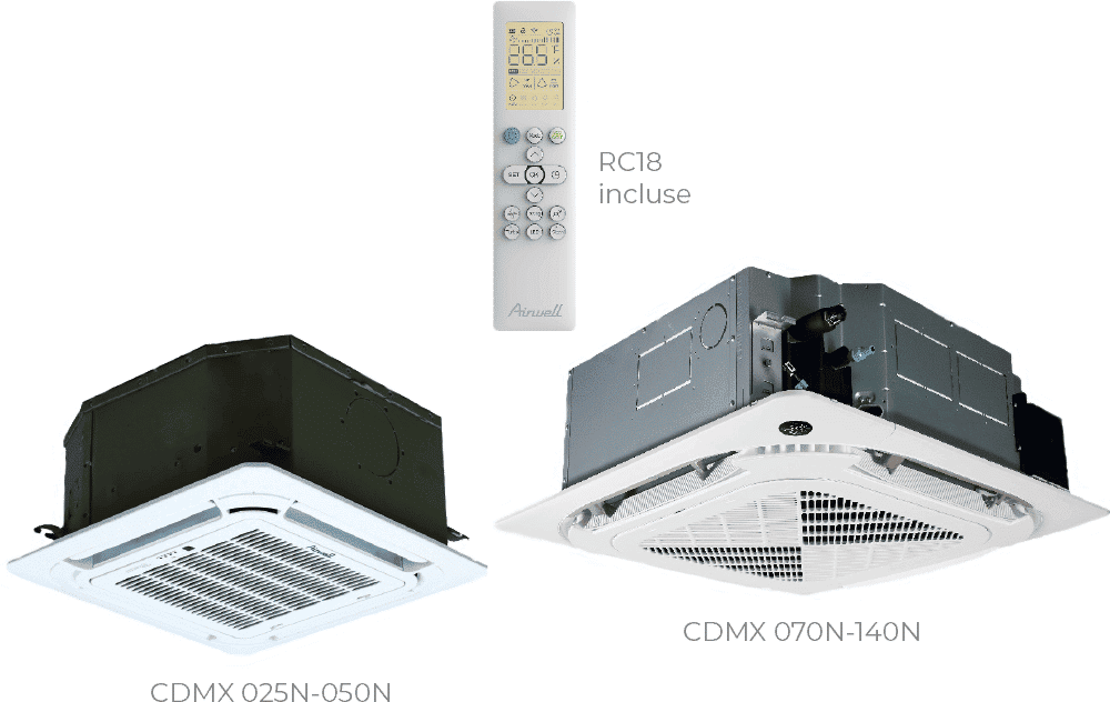 Grote range cassette single-split en multi-slave airconditioning (2,2~14 kW), t/m 5 kW 600x600, vanaf 7 kW 900x900, Geintegreerde condenspomp, 360 graden uitblaas. Opties: vaste bediening, Centrale bediening tot 64 systemen, BMS gateway tot 1024 units.