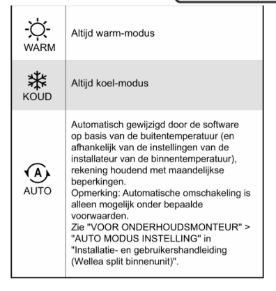 AUTO ⚙️ – het systeem kiest automatisch, afhankelijk van de buitentemperatuur en de instellingen van de installateur